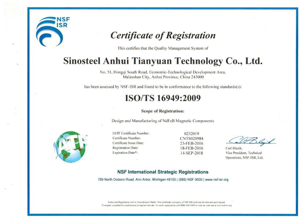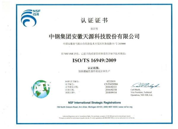 中鋼天源釹鐵硼廠ISO/TS16949:2009質(zhì)量管理體系認(rèn)證工作,經(jīng)過半年多時間的積極準(zhǔn)備,順利通過了審核專家組的審核,近日收到了NSF-ISR認(rèn)證公司頒發(fā)的認(rèn)證證書。