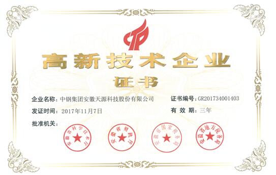 近日,中鋼天源收到安徽省科技廳、安徽省財(cái)政廳、安徽省國(guó)家稅務(wù)局、安徽省地方稅務(wù)局聯(lián)合頒發(fā)的高新技術(shù)企業(yè)證書(shū),標(biāo)志著中鋼天源順利通過(guò)2017年第二批“高新技術(shù)企業(yè)”重新認(rèn)定。這是對(duì)公司多年來(lái)堅(jiān)持自主研發(fā)、技術(shù)創(chuàng)新、堅(jiān)持走高新技術(shù)發(fā)展道路的有力肯定。