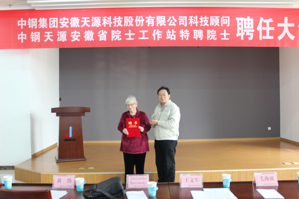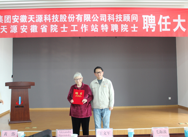 毛海波總經(jīng)理在會上介紹了Alexandra Navrotsky的簡況。隨后公司董事長、黨委書記王文軍與副總工程師裴曉東分別為Alexandra Navrotsky頒發(fā)了中鋼天源科技顧問、院士工作站特聘院士的聘書。聘任儀式結(jié)束后, Alexandra Navrotsky為參會人員作了主題為“A Career in Thermodynamics , Geochemitry and materials science”(熱力學(xué)、地球化學(xué)和材料科學(xué)領(lǐng)域的研究概況)的學(xué)術(shù)講座。