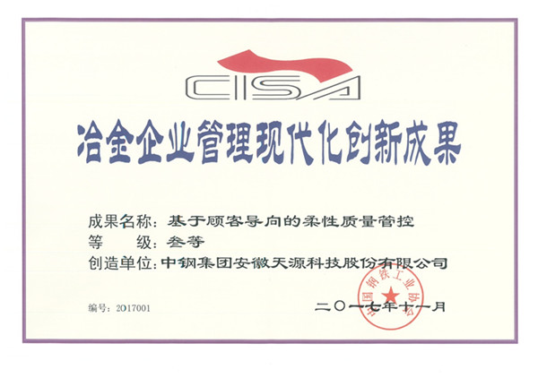 據(jù)悉,2017年冶金企業(yè)管理現(xiàn)代化創(chuàng)新成果評(píng)選結(jié)果日前揭曉,中鋼天源本部申報(bào)的管理創(chuàng)新成果《基于顧客導(dǎo)向的柔性質(zhì)量管控》榮獲三等獎(jiǎng)。