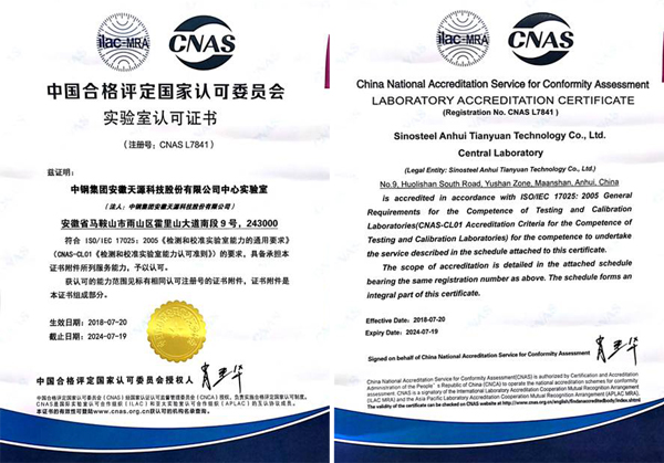 針對(duì)現(xiàn)場(chǎng)評(píng)審提出的問題和不符合項(xiàng),中 心實(shí)驗(yàn)室經(jīng)過近1個(gè)月的整改,于2018年7月初將整改報(bào)告遞交至CNAS秘書處,CNAS于2018年7月20日向中鋼天源中 心實(shí)驗(yàn)室頒發(fā)了實(shí)驗(yàn)室認(rèn)可證書。